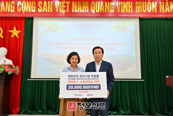 목포시는 지난 23일 7만여 명의 회원으로 구성된 베트남 하노이 한인회(회장 장은숙)를 방문, 급속도로 성장하는 베트남 전역에 우리시 문화예술과 관광 자원을 널리 홍보하는 견인차 역할을 할 수 있도록 당부하는 자리를 가졌다. 또, 지난 24일 박홍률 목포시장은 최근 태풍 야기로 인한 30명 이상의 사상자가 발생하는 등 큰 피해를 입은 하이퐁 시를 방문해 조속한 피해 복구를 기원하면서 수재의연금 100만원을 사재로 기탁하고 격려했다.