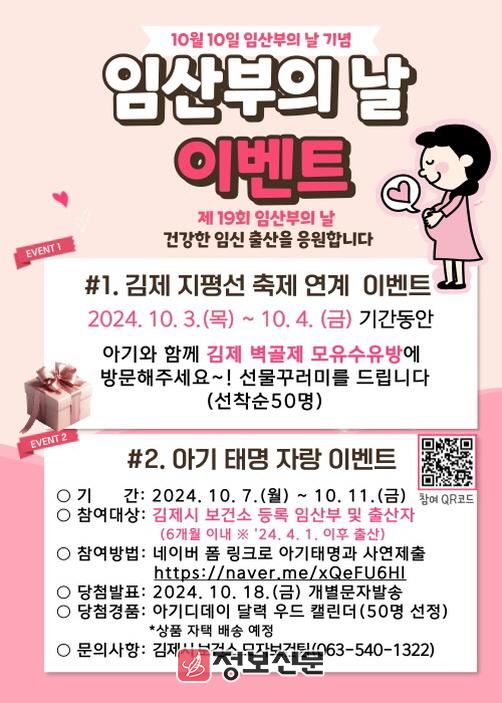 김은주 건강증진과장(직무대리)은 “임산부의 날 운영을 통해 출산의 중요성을 알리고, 임산부를 배려하는 출산 친화적 분위기를 조성하여 아이 낳기 좋은 김제시를 만들기 위해 노력하겠다”고 말했다.