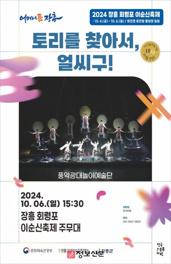 장흥군 관계자는 “2024년 회령포 이순신 축제 기간동안 개최되는 풍악광대놀이예술단 ‘토리를 찾아서, 얼씨구!’공연에 군민들의 관심과 참여를 바라며 앞으로도 다양한 장르의 공연이 개최될 수 있도록 노력할 것”이라고 전했다.