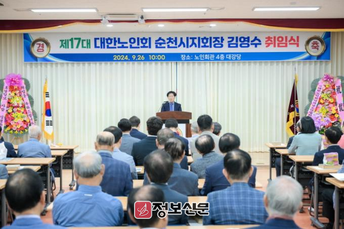 김영수 대한노인회 순천시지회장은 2020년부터 2024년까지 제16대 순천시 노인회장을 역임하며, 지난 8월 후보자 단독 등록으로 제17대 노인회장에 당선됐다. 김영수 노인회장의 임기는 2028년 9월 25일까지 4년이다.