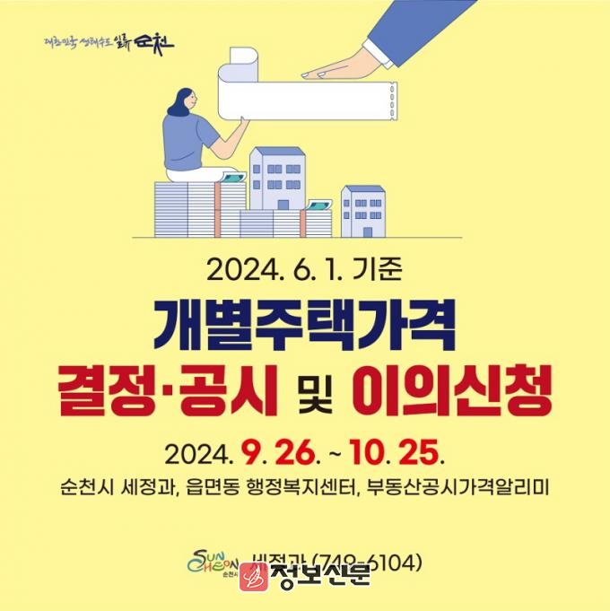 개별주택가격은 순천시 누리집(https://www.suncheon.go.kr)과 부동산공시가격알리미(https://www.realtyprice.kr)를 통해 열람 가능하고, 가격에 이의가 있는 소유자 등은 10월 25일까지 순천시 세정과 또는 각 읍면동 행정복지센터에 이의 신청서를 제출하면 된다.