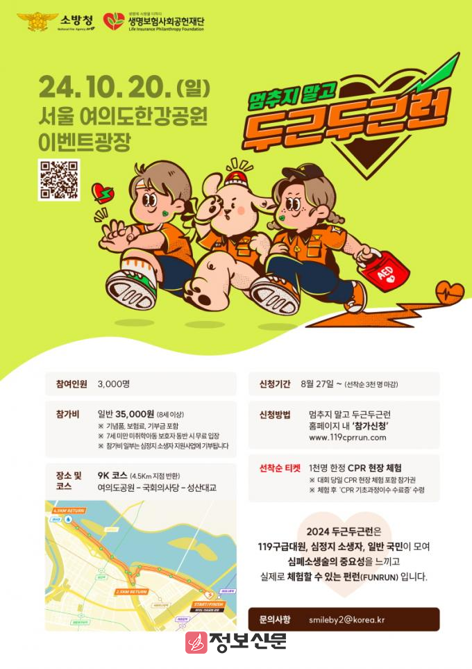 이번 마라톤 코스는 여의도공원-국회의사당-성산대교를 통과하는 총 9km로 1km마다 심정지 환자 발견 시 필요한 심폐소생술 단계를 학습할 수 있는 펀런(FUN RUN) 형식으로 진행되며, 참가를 원하는 국민 누구나 참여 가능하다.