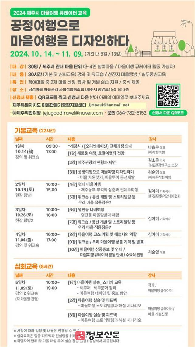 교육 인원은 30명 내외로, 마을별 3~4인 팀으로 구성하여 신청하면 된다. 모집기간은 9월 30일부터 10월 10일까지이며, 신청서를 작성하여 이메일(mjre0722@jejumaeul.or.kr, jejugoodtravel@naver.com)로 접수하면 된다.