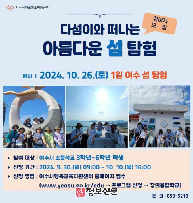 ![]() 여수시(시장 정기명)는 오는 10월 26일 초등학교 3~6학년 학생을 대상으로 ‘다섬이와 떠나는 아름다운 섬탐험’ 프로그램을 운영한다. |