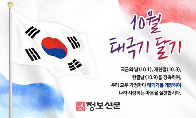 각 가정과 기업, 단체에서는 오는 국군의 날(10월 1일)과 개천절(10월 3일), 한글날(10월 9일) 오전 7시부터 오후 6시까지 태극기를 게양하면 된다. 또, 국군의 날부터 한글날까지 연속해 게양해도 된다.