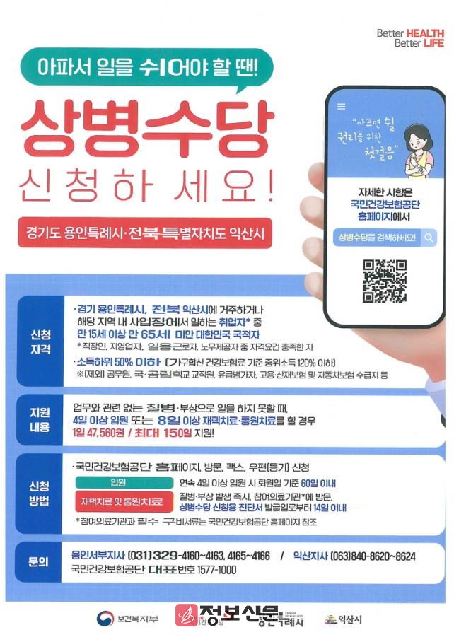 상병수당 지원 대상은 15세 이상 65세 미만의 기준중위소득 120% 이하 근로자여야 하며, 4일 이상 입원하거나 8일 이상 재택·통원 치료를 받아야 한다. 국민건강보험공단 익산지사에 상병수당을 신청하면 심사를 거쳐 1일 47,560원씩 최대 150일 소득 지원을 받을 수 있다.