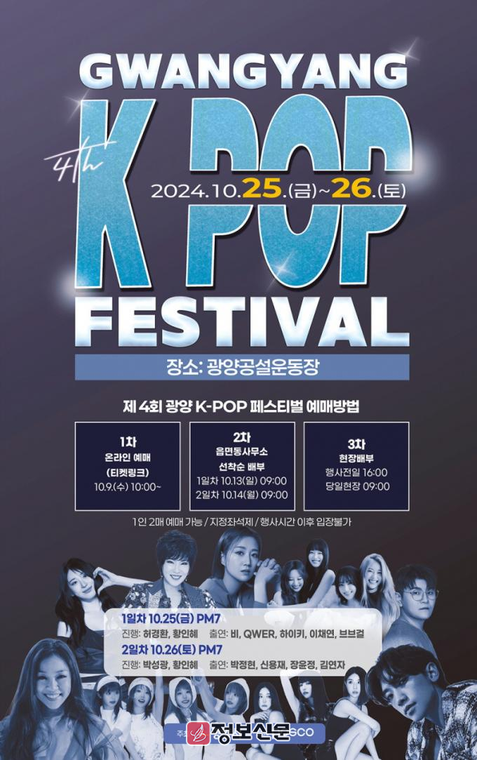 김성수 관광과장은 “오는 9일 티켓오픈을 시작으로 제4회 광양 K-POP 페스티벌에 대한 관심과 열기가 뜨거워질 것으로 예상된다”라며 “모든 사람에게 축제 관람 기회를 공평하게 제공하기 위해 입장권 배부 일정과 배부 방식을 세분화한 만큼 광양시민과 관광객의 많은 관심과 참여를 바란다”라고 말했다.