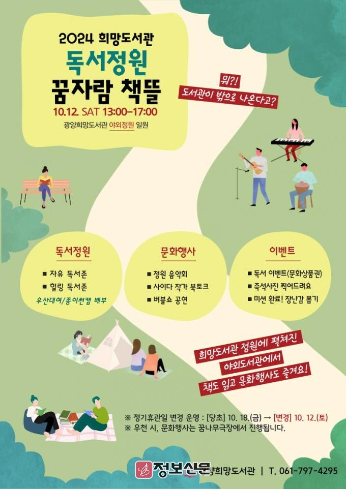 행사 참여는 사전 신청 없이 행사 당일인 10월 12일 1시부터 자유롭게 참여 가능하다. 자세한 사항은 시립도서관 누리집(https://lib.gwangyang.go.kr)을 확인하거나 희망도서관에 전화(☎ 061-797-4295)로 문의하면 알 수 있다.
