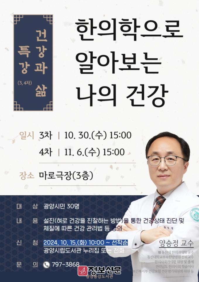 김미라 도서관과장은 “이번 건강과 삶 특강이 시민들에게 올바른 건강 지식과 관리법을 알려주고, 도서관이 다양한 정보 제공의 장으로 자리매김하는 데 기여할 것으로 기대된다”며 “앞으로도 유익한 강의를 통해 시민들의 문화생활을 지원할 계획이다”고 밝혔다.
