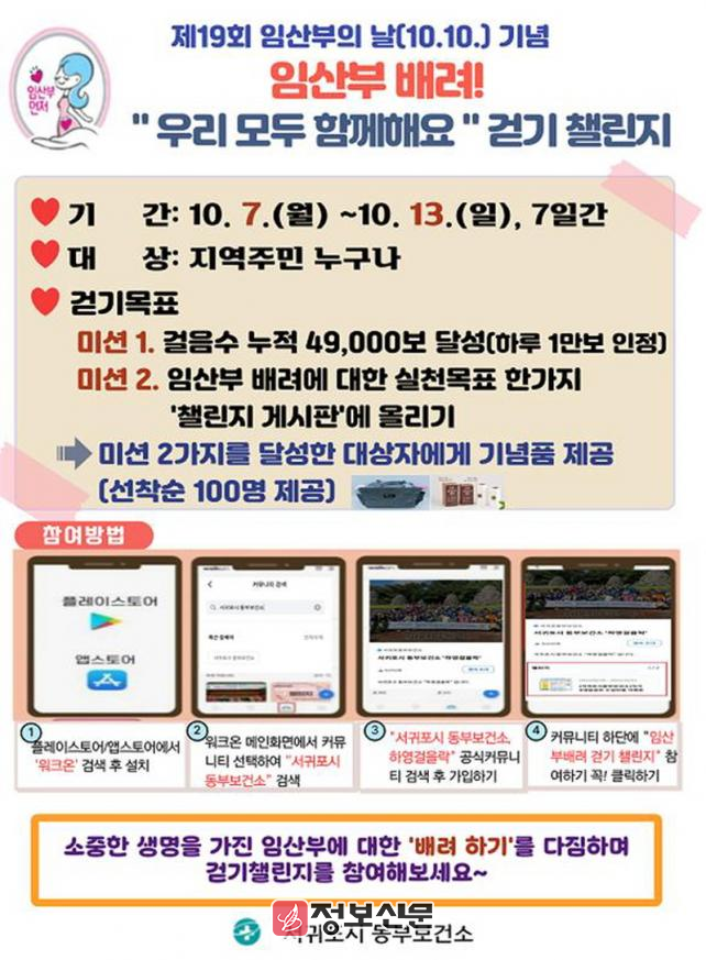 ![]() 서귀포시, 제19회 임산부의 날 기념 주간 임산부 배려 걷기 챌린지 운영 |