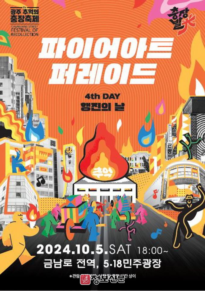 충장 파이어아트 퍼레이드는 5일 오후 6시부터 8시 30분까지 금남로 일대에서 3부로 나뉘어 열린다. 화려한 불꽃과 상징물 그리고 동구 주민들이 그간 열정을 담아 준비한 행렬을 볼 수 있다. 특히 3부에서 보여줄 상징물 태우기는 그간 어디서도 볼 수 없었던 장관을 연출할 것으로 기대를 모은다.