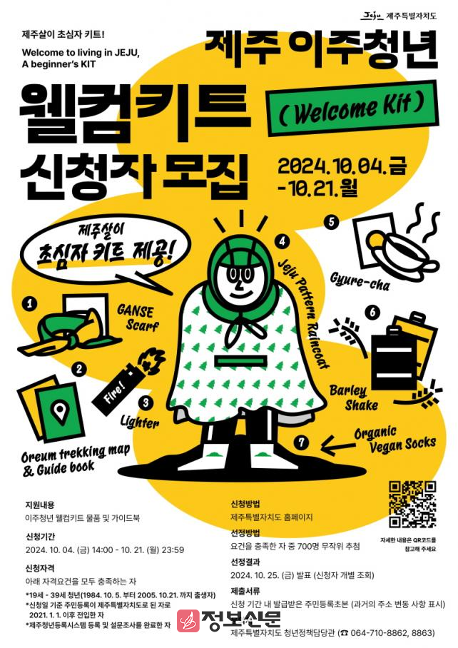 이주청년 웰컴키트는 오는 21일까지 제주도 누리집*을 통해 신청할 수 있다. 신청자들은 주민등록초본(과거의 주소 변동 사항 표시/주민등록번호 뒷자리 불포함)을 제출해야 하며, 선정 결과는 오는 10월 25일 발표할 예정이다. 조회 선정된 700명의 이주청년들에게는 제주지역 특색을 담은 7종 세트가 지급된다.