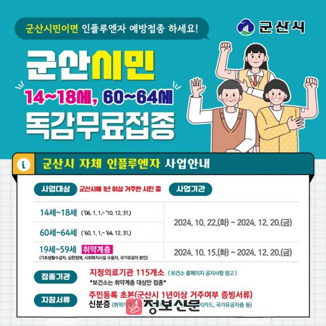 특히, 군산시는 14~64세 취약계층에서 실시하던 지자체 인플루엔자 예방접종을 위해 자체 예산을 마련하여 19~59세 취약계층, 14~18세 및 60~64세 군산시민으로 확대하여 시행한다.