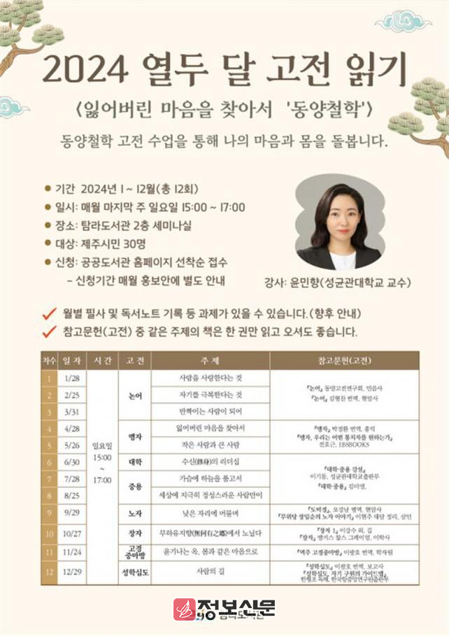 한편, 2017년부터 탐라도서관에서 고전 읽기 캠페인으로 시작한 ‘열두 달 고전 읽기’는 고전을 읽고 학자와 함께 해석을 공유하는 탐라도서관 대표 프로그램이다.