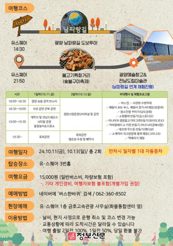 차량은 오후 2시 30분에 광주 유스퀘어 3번 홈을 출발한다. 광양에 도착한 참여자들은 광양읍권의 남파랑길을 걸어본 후 광양예술창고, 전남도립미술관 등 관람에 나선다. 저녁에는 광양전통숯불구이축제가 열리는 광양불고기특화거리로 이동해 식사를 해결하고 축제를 즐긴 뒤 9시 50분에 광주 유스퀘어에 도착하는 것으로 일정이 종료된다.