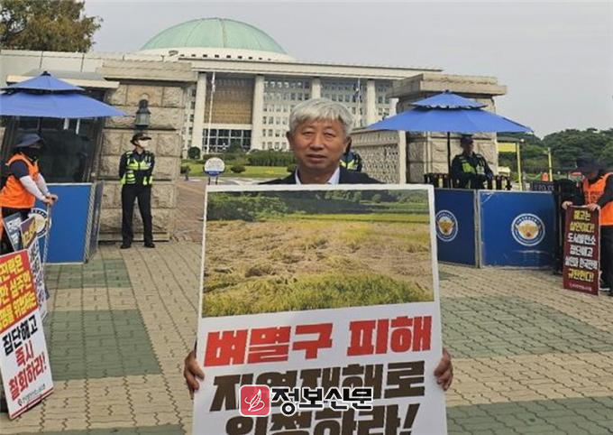 ![]() 박형대 의원(진보당ㆍ장흥1)이 국회 앞에서 벼멸구 피해를 농업재해로 인정하라고 시위하고 있다. |