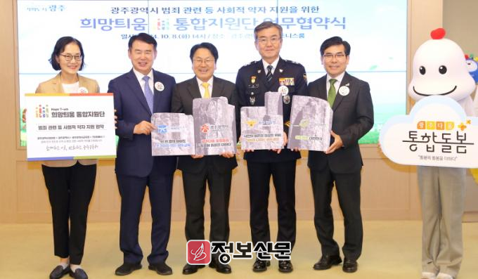 광주광역시(시장 강기정)는 8일 시청 비즈니스룸에서 광주시교육청, 광주경찰청, 사회복지법인 굿네이버스 등 4개 기관·단체와 ‘광주시 범죄 관련 등 사회적 약자 지원을 위한 희망틔움 통합지원단 업무협약’을 체결했다.