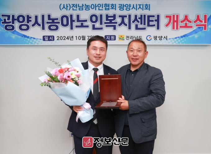 ![]() 임형석 전남도의원이 10월 7일, 광양시농아노인복지센터 개소식에서 (사)전남농아인협회 김재철 광양시지회장에게 감사패를 받고 함께 기념사진을 찍고 있다. |