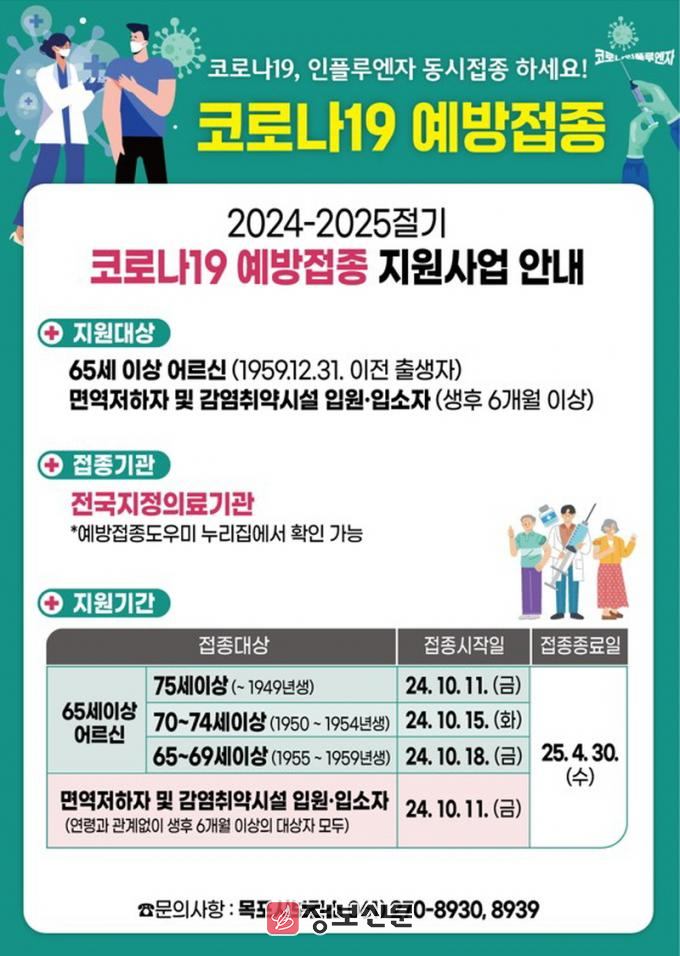 목포시 관계자는 “매년 유행하는 코로나19 변이 바이러스가 달라지기 때문에 고위험군은 매년 접종하는 것이 중요하다”며 “65세 이상 어르신은 접종기관 한번 방문으로 코로나19와 인플루엔자 백신을 동시 접종 받으시기를 당부드린다”고 전했다.