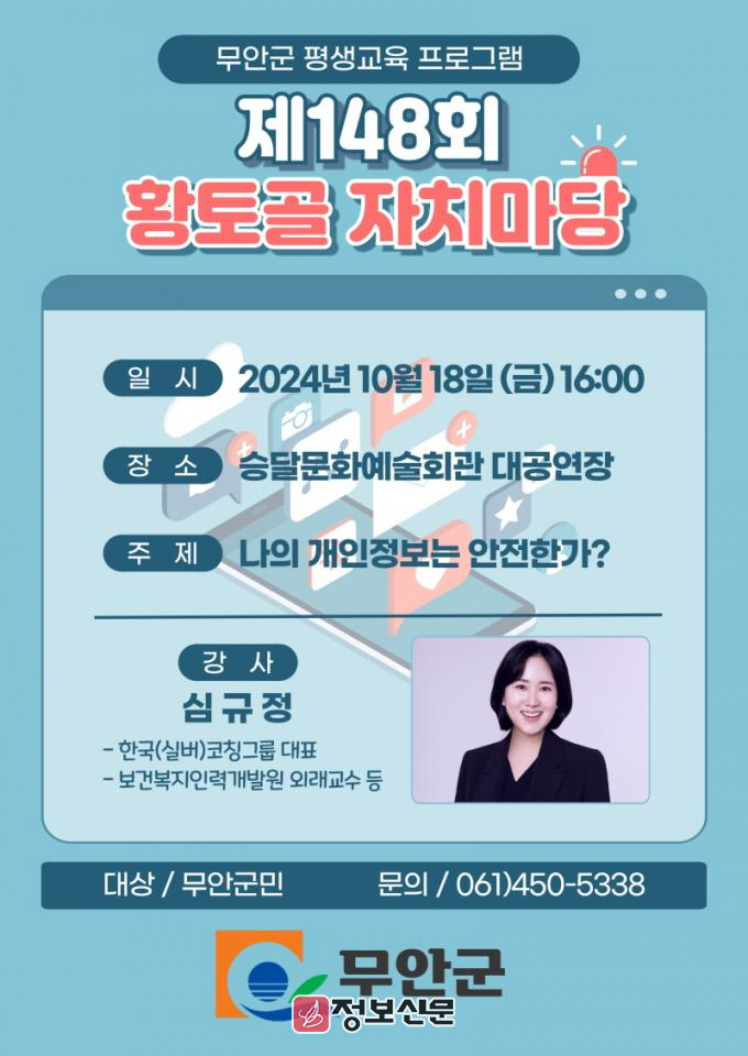 이번 황토골 자치마당에서는 최근 발생한 개인정보 유출 사례를 바탕으로 일상 속 개인정보 유출의 원인과 위험성 및 개인정보 노출 피해를 줄이기 위한 SNS 이용 주의사항, 보이스피싱 피해 예방 수칙 등 개인정보 실천 규칙을 알기 쉽게 풀어내는 유익한 강연이 진행될 예정이다.