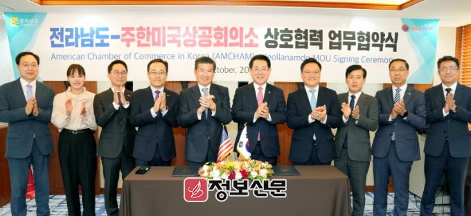 ![]() 김영록 전라남도지사가 11일 서울 코리아나호텔에서 열린 ‘전남도-주한미국상공회의소(AMCHAM) 업무협약식’에 참석해 제임스 김 주한미국상공회의소 회장과 시장경제 활성화 및 수출 진흥 상호 지원 협력을 위한 업무협약을 체결하고 있다.