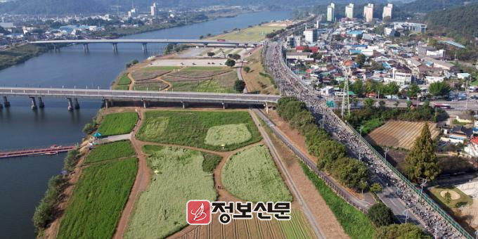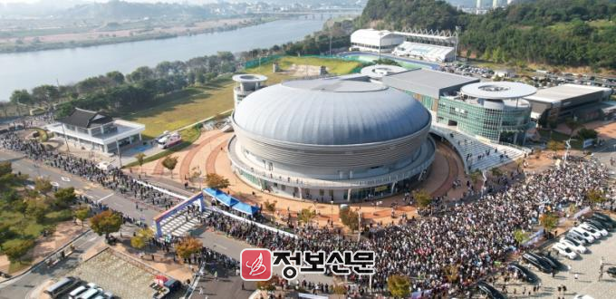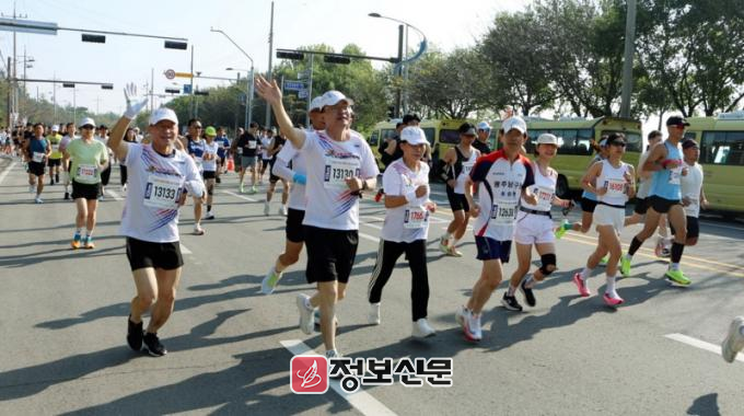 대회 시작을 한 시간 앞둔 오전 8시부터 종합스포츠파크 일대엔 빈공간을 찾아볼 수 없을 정도로 엄청난 구름 인파로 장사진을 이뤘다. 마라톤대회는 5km·10km·하프(21.0975km)·풀코스와 단체전 팀 대항(하프)까지 총 5개 종목으로 치러졌다.