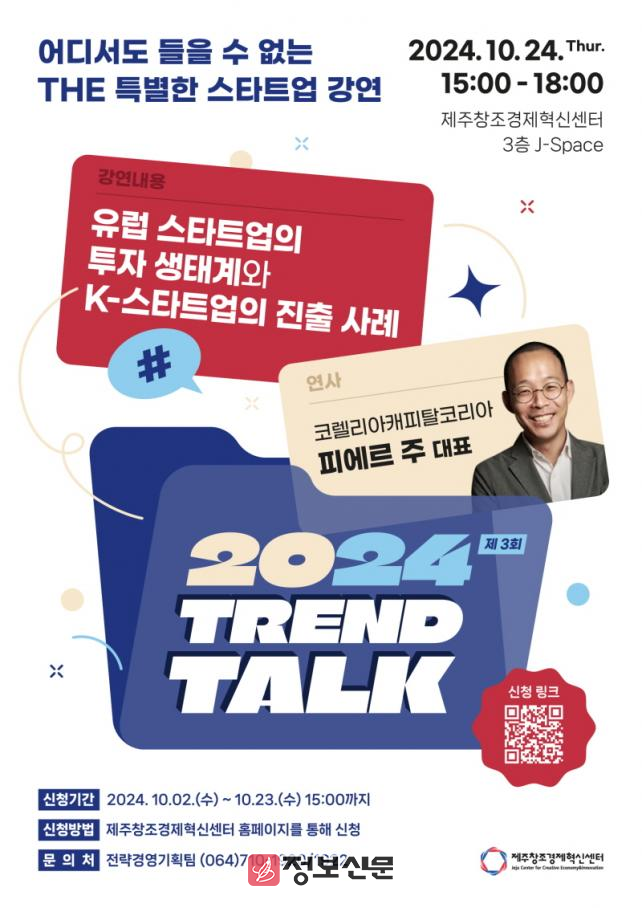 2024년 제3회 TREND TALK 프로그램은 ‘유럽 스타트업의 투자 생태계와 K-스타트업의 진출 사례’을 주제로 오는 24일 오후 3시 제주벤처마루 3층 J-Space에서 열린다.