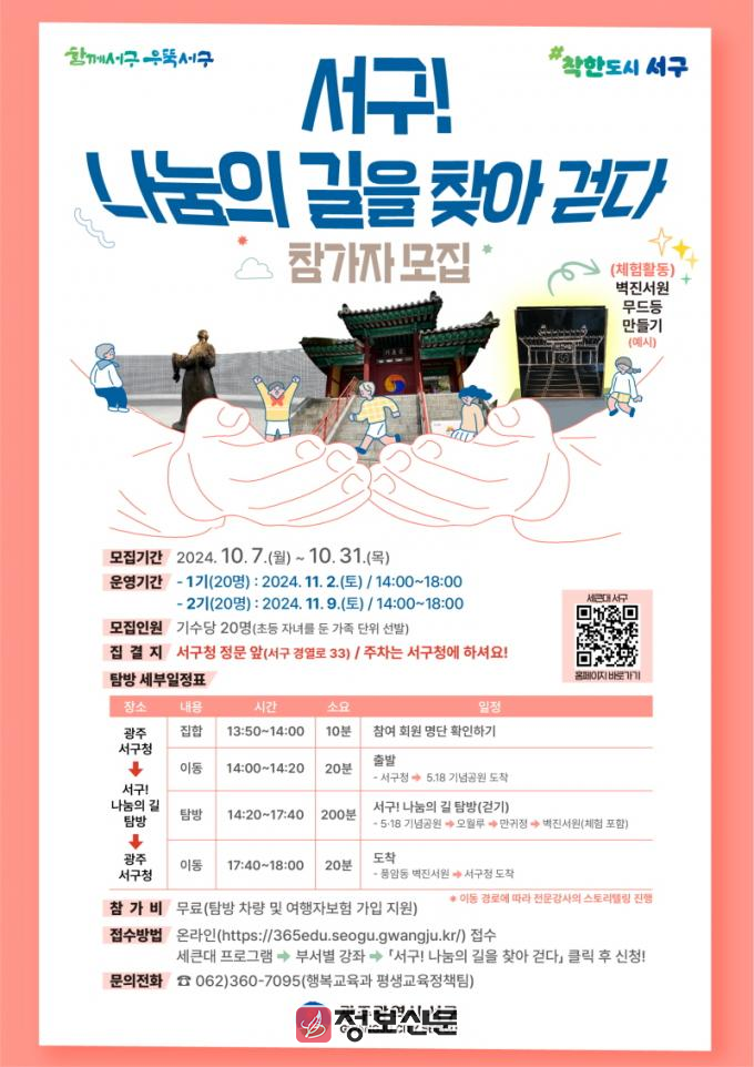 이번 프로그램은 ▲오월항쟁과 광주 시민의 나눔 정신을 배울 수 있는 5·18 기념공원과 오월루 ▲누정(樓亭)과 만드리의 나눔에 대해 이야기 나눌 수 있는 만귀정 ▲회재 박광옥 선생의 노블레스 오블리주 정신과 삶을 배울 수 있는 벽진서원 등을 탐방하며 ‘착한도시 서구’의 나눔과 연대의 가치를 체험해 보는 시간으로 진행된다.