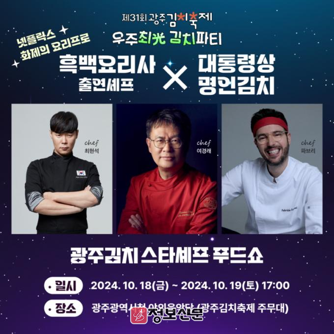 ‘광주김치 스타셰프 푸드쇼’는 광주김치축제 주무대인 광주시청 야외음악당에서 18~19일 이틀 간 열린다. 방송프로그램 ‘흑백요리사’ 출연진인 유명셰프 최현석, 여경래, 파브리치오 페라리, 사찰음식 대가인 정관스님이 참여한다.