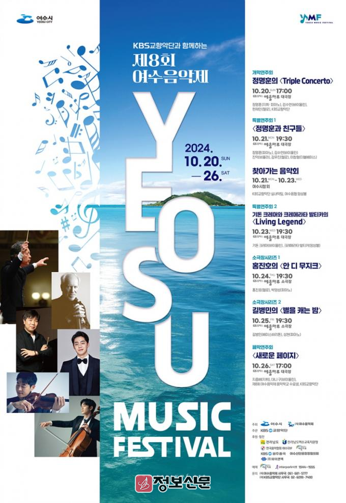 여수시(시장 정기명)에 따르면 ‘여수음악제’는 지역사회 클래식 음악 보급과 음악교육을 통한 인재 육성을 목적으로 8회째를 맞이했으며, 올해는 (재)여수음악제로 공식 출범하여 새로운 전환과 도약을 준비하고 있다. 20일 음악제의 포문을 여는 개막연주회에서는 마에스트로 정명훈이 지휘봉을 잡음과 동시에 피아니스트로 무대에 올라 바이올리니스트 김수연, 첼리스트 한재민과 베토벤의 ‘트리플 콘체르토(삼중협주곡)’를 연주할 예정이다.