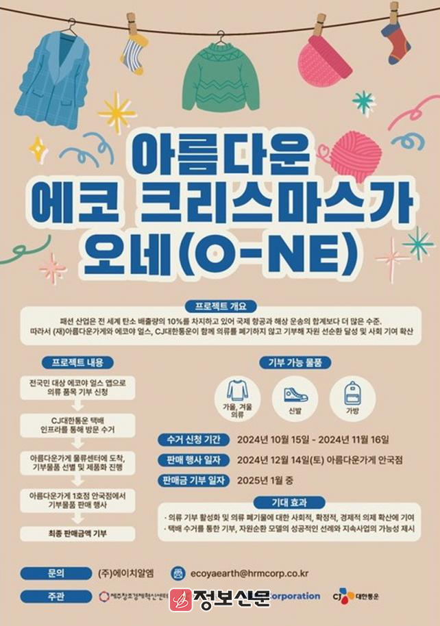 ‘아름다운 에코 크리스마스가 오네(O-NE)’ 프로젝트는 전 국민을 대상으로 10월 15일부터 11월 16일까지 가을, 겨울 의류와 신발, 가방 등의 품목을 기부받을 예정이다. CJ대한통운이 전국 택배 인프라를 활용해 기부 물품을 수거한다.