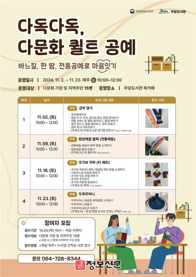 ![]() 제주시 우당도서관, 다독다독 다문화 퀼트 공예 참여자 모집 |