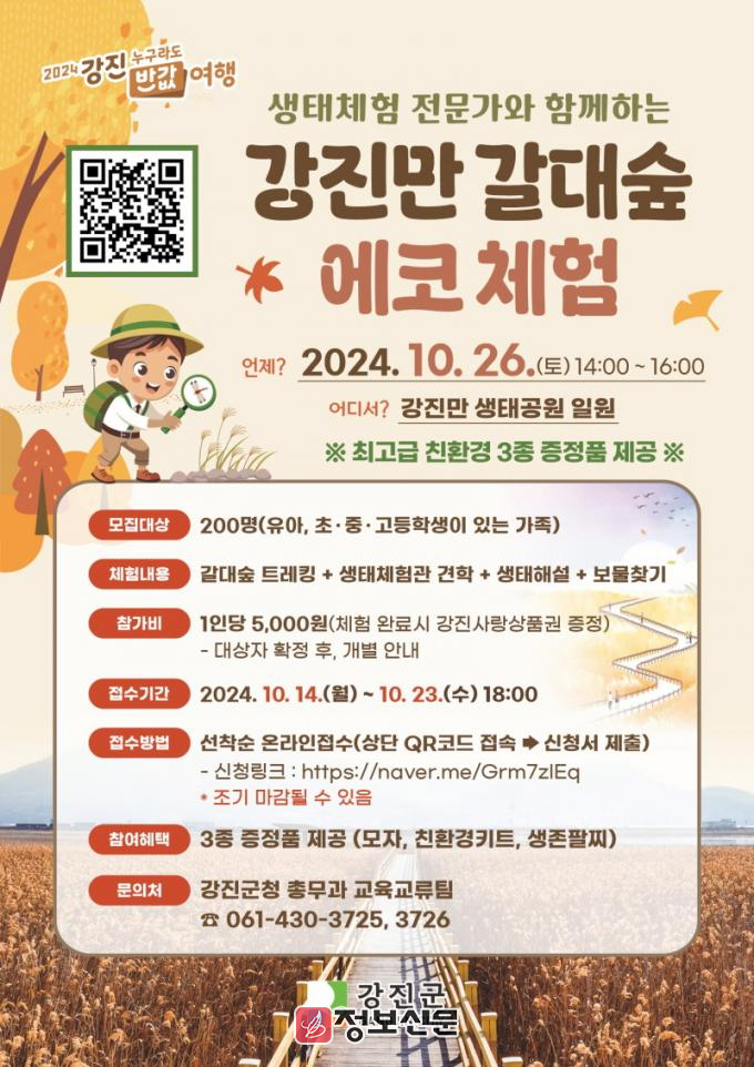 이번 행사는 생태체험 전문가와 함께하는 강진만 갈대숲 에코 체험으로, 유아 및 초·중·고등학생이 있는 가족 200명을 대상으로 진행된다. 참가비는 1인당 5,000원이며, 참가 완료 시 ‘강진사랑상품권’으로 참가비를 전액 돌려받는다.