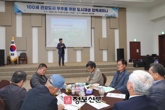 이용재 도시재생지원센터 사무국장이 진행한 1부 주제 발표에서 ㈜거름의 백종인 소장은 “무주, 왜 100세 건강도시인가?”라는 주제로 △자연특별시 무주의 특성과 △현황, △건강도시 무주 비전, △건강도시와 도시재생 뉴딜사업의 내용을 공유하고 △2025년 지방소멸대응기금 투자계획과 사업 내용 등을 언급해 관심을 모았다.