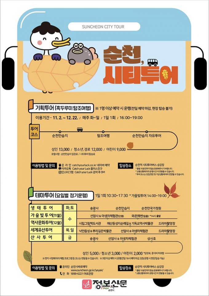 순천시 관계자는 “11월 여행가는 가을 순천의 아름다운 풍경을 더욱 편리하게 감상하고 싶다면 순천시티투어 버스를 이용해 보길 추천한다”고 말했다.