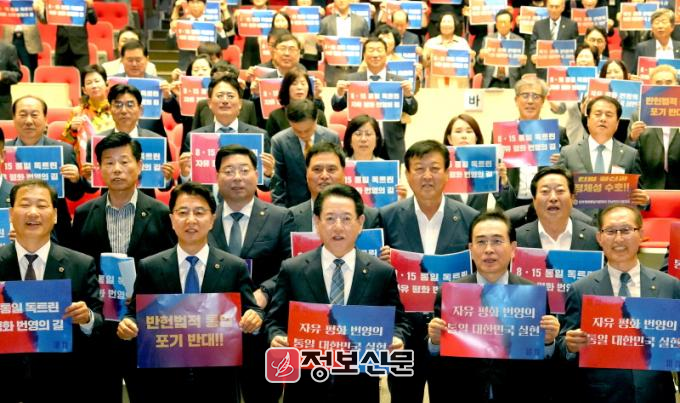![]() 민주평화통일자문회의 제21기 전남지역회의가 17일 도청 김대중강당에서 열린 가운데 김영록 전라남도지사가 참석자들과 ‘자유 평화 번영의 통일 대한민국’을 위한 퍼포먼스를 하고 있다. |
