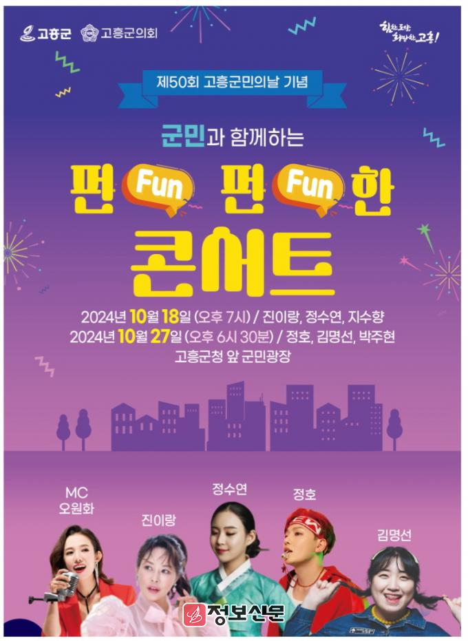 한편, 고흥군은 10월 한 달간 진행되는 ‘펀펀한 콘서트’ 외에도 ‘녹동항 드론쇼 거리공연(버스킹)’과 ‘수상한 외갓집’ 뮤지컬 공연 등 지역맞춤형 중소규모 콘텐츠 유통 사업 공연을 11월 말까지 진행할 계획이다.