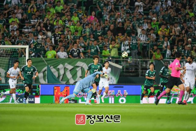 대전이 추가골 기회를 잡았다. VAR 판독 끝에 전북 수비 핸드볼 파울로 페널티킥을 얻어낸 것. 하지만 전북은 골키퍼 김준홍이 마사의 페널티킥을 막아냈다.