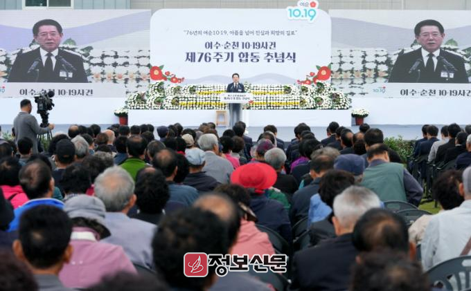 김영록 지사는 추념사를 통해 “긴 세월, 깊은 아픔과 상처를 안고 견딘 희생자와 유가족께 진심 어린 위로의 말씀을 올린다”며 “76년의 여순사건이 아픔을 넘어 진실과 희망의 길로 나아가도록 전남도가 꺼지지 않은 등불이 돼 환히 밝히겠다”고 말했다. 이어 “여순사건의 온전한 진상규명과 명예회복을 위해 여순사건특별법 개정에도 온힘을 쏟겠다”고 강조했다.