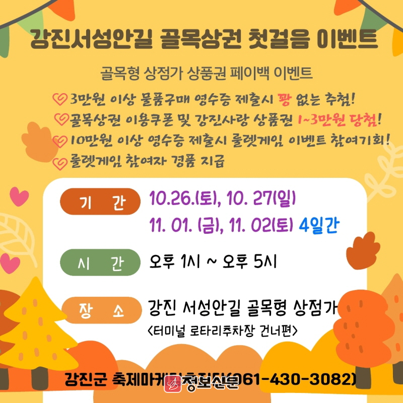 이번 이벤트는 지난 3월 소외된 골목상권의 활성화를 목적으로 한 전라남도 주관 ‘전남형 골목상권 첫걸음 공모사업’에 강진군이 선정되어 확보한 사업비로 진행된다.