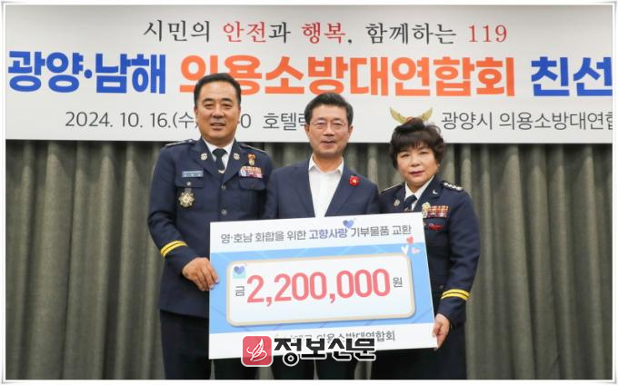 광양 의용소방대연합회와 남해군 의용소방대연합회는 상생협력을 약속하는 한편 지역 발전을 응원하는 차원에서 상대 지자체에 각각 220만 원을 기부했다.
