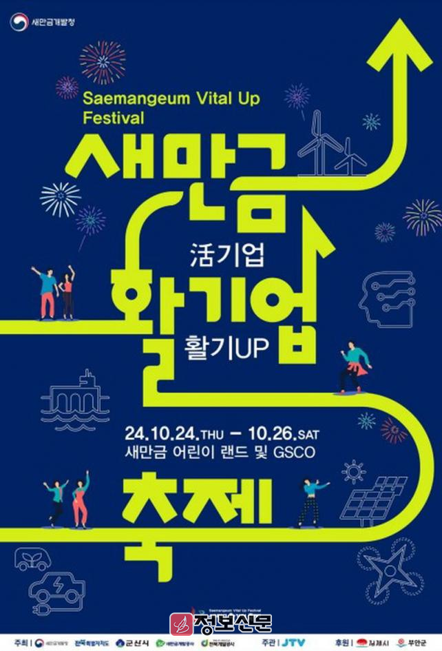 군산시는 24일부터 26일까지 3일 동안 군산시 새만금 어린이랜드 및 GSCO에서 ‘새만금 활기업 축제’가 개최된다고 밝혔다. 이번 행사는 군산시를 비롯해 새만금개발청, 전북특별자치도, 새만금개발공사, 전북개발공사가 함께 주최한다.
