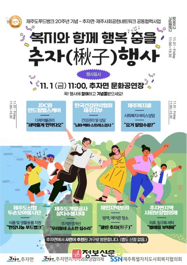 제주특별자치도사회복지협의회 산하 제주도푸드뱅크는 오는 11월 1일 오전 11시부터 오후 3시 30분까지 제주시 추자면 문화공연장 등지에서 ‘복지와 함께 행복 춤을 추자(楸子)’ 행사를 개최한다고 밝혔다.