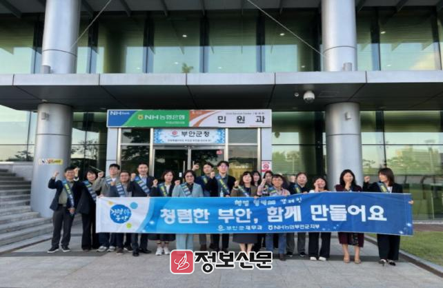재무과와 NH농협 부안군 지부는 지역단위 반부패‧청렴 활동 네트워크를 만들어 부패방지 체계를 확립하고자 청렴 협력체를 구성하고 협약을 맺었으며, 앞으로도 청렴교육, 조직문화개선을 위한 실천운동 등을 통해 민‧관 청렴 협력을 증대할 예정이다.