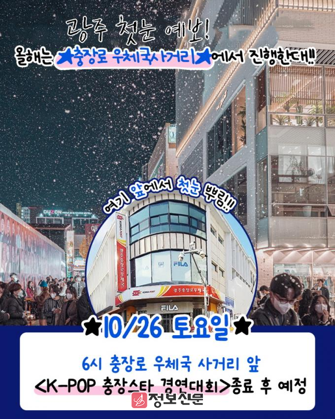 이날 메인 이벤트는 ‘첫 눈’으로, 충장로 우체국 사거리에 내리는 전국 최초의 첫눈을 선보일 예정이다. 가을에 만나는 눈이라는 특별한 콘셉트와 함께 크리스마스 트리와 포토존 등을 설치하고 다양한 공연도 펼쳐 방문객의 발길을 이끌어낸다는 구상이다.