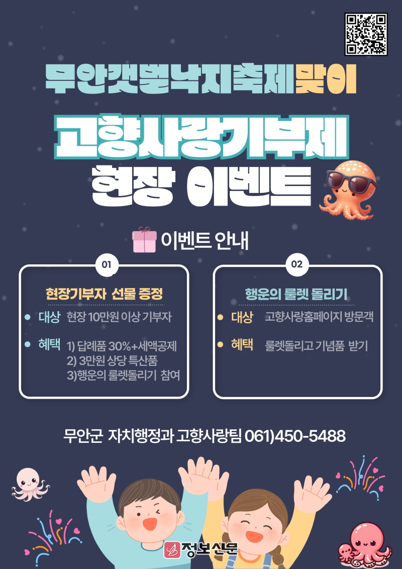 ![]() 무안군, 무안갯벌낙지축제장에서 고향사랑기부 이벤트 운영 |