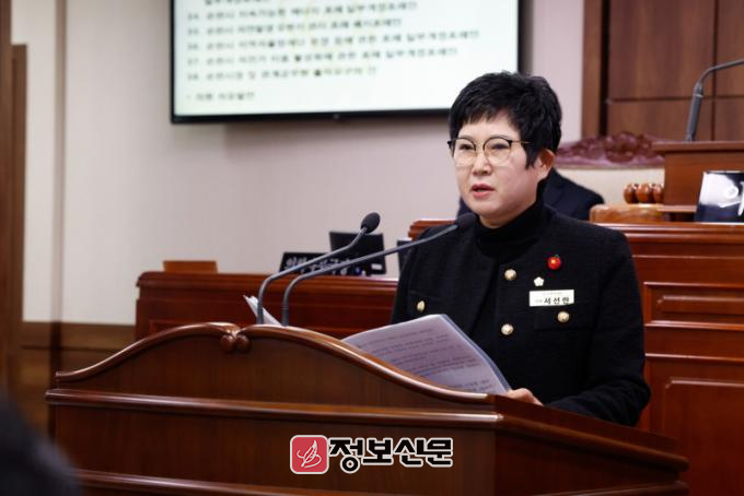 서선란 의원은 “의회의 시정에 대한 질문은 시정 전반에 대하여 의원이 질문하고 집행부가 답변하는 의회의 중요한 기능 중의 하나”라며, “시의회에서 집행부에 시정질문 질의서로 요청할 때는 그 분야와 관련된 업무를 파악하여 성실히 답변해 주셔야 한다”고 말했다.