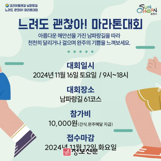 ![]() 순천시, 「느려도 괜찮아! 마라톤 대회」 참가자 모집 |