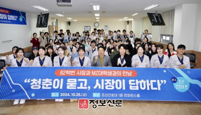 강 시장은 25일 오후 조선간호대학교에서 ‘청춘이 묻고 시장이 답하다’를 주제로 현장대화를 열었다. 강 시장은 대학생 청년들과 눈맞춤 소통을 통해 학생들의 꿈을 응원하고, 청년들의 다양한 의견을 시정에 반영하기 위해 현장대화를 이어오고 있다.