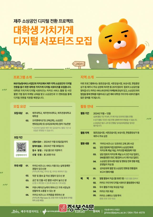 이번 프로그램을 통해 소상공인은 맞춤형 디지털 전환 컨설팅을, 대학생은 실무 경험과 경력 개발 기회를 얻을 것으로 기대하고 있다. 지난 10월 18일부터 11월 3일까지 제주대학교, 제주한라대학교, 제주관광대학교 재학생들을 대상으로 서포터즈를 모집하고 있다.